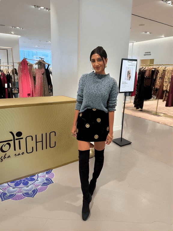 Born and raised in Queens, NY, to immigrant parents, Rao grew up straddling two worlds — draping her mother’s saris one day and styling denim jackets the next. What began as a personal act of self-expression has evolved into holiCHIC, a million-dollar brand carried by Nordstrom and Amazon Fashion. Today, her collections fuse Eastern craftsmanship with Western silhouettes, creating statement pieces that speak to confidence, culture, and individuality.